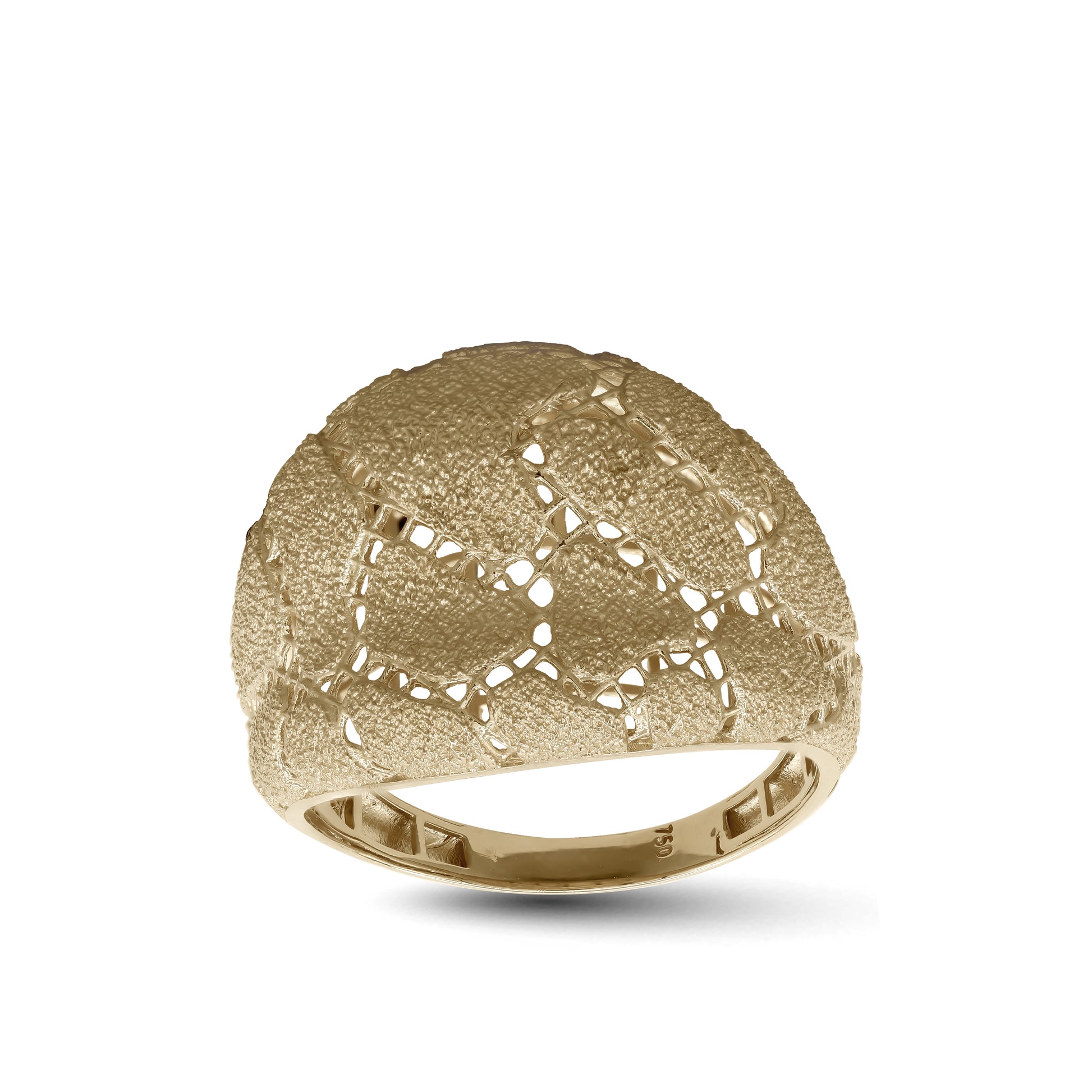 This 18k Yellow Gold Textured Dome Ring is a bold and elegant piece, featuring a beautifully textured finish with intricate geometric cutouts. Its unique dome shape gives it a modern yet timeless look — perfect for making a statement.