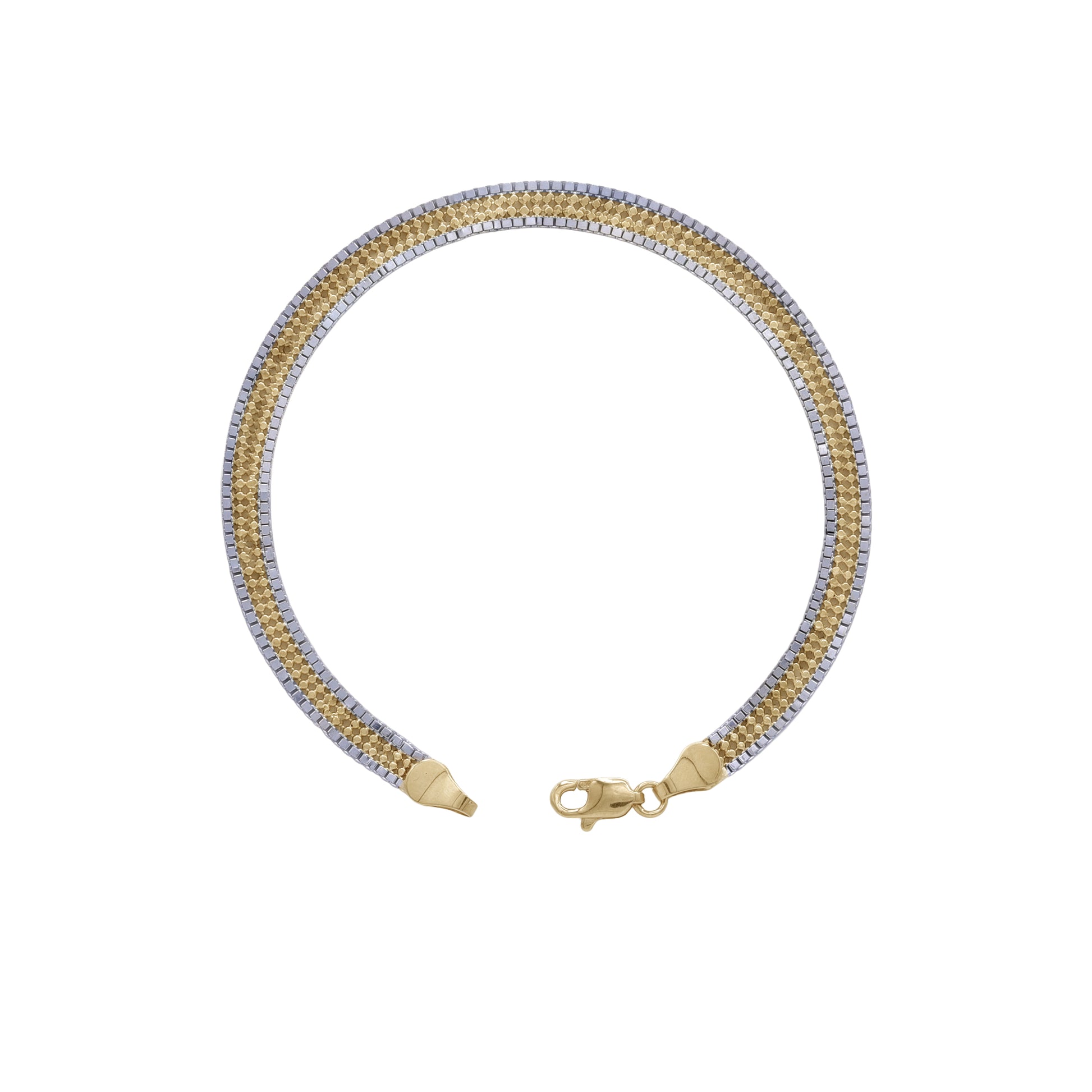 This 18k Gold Mesh Bracelet offers a timeless look with its elegant two-tone design, making it the perfect accessory for both everyday wear and special occasions.