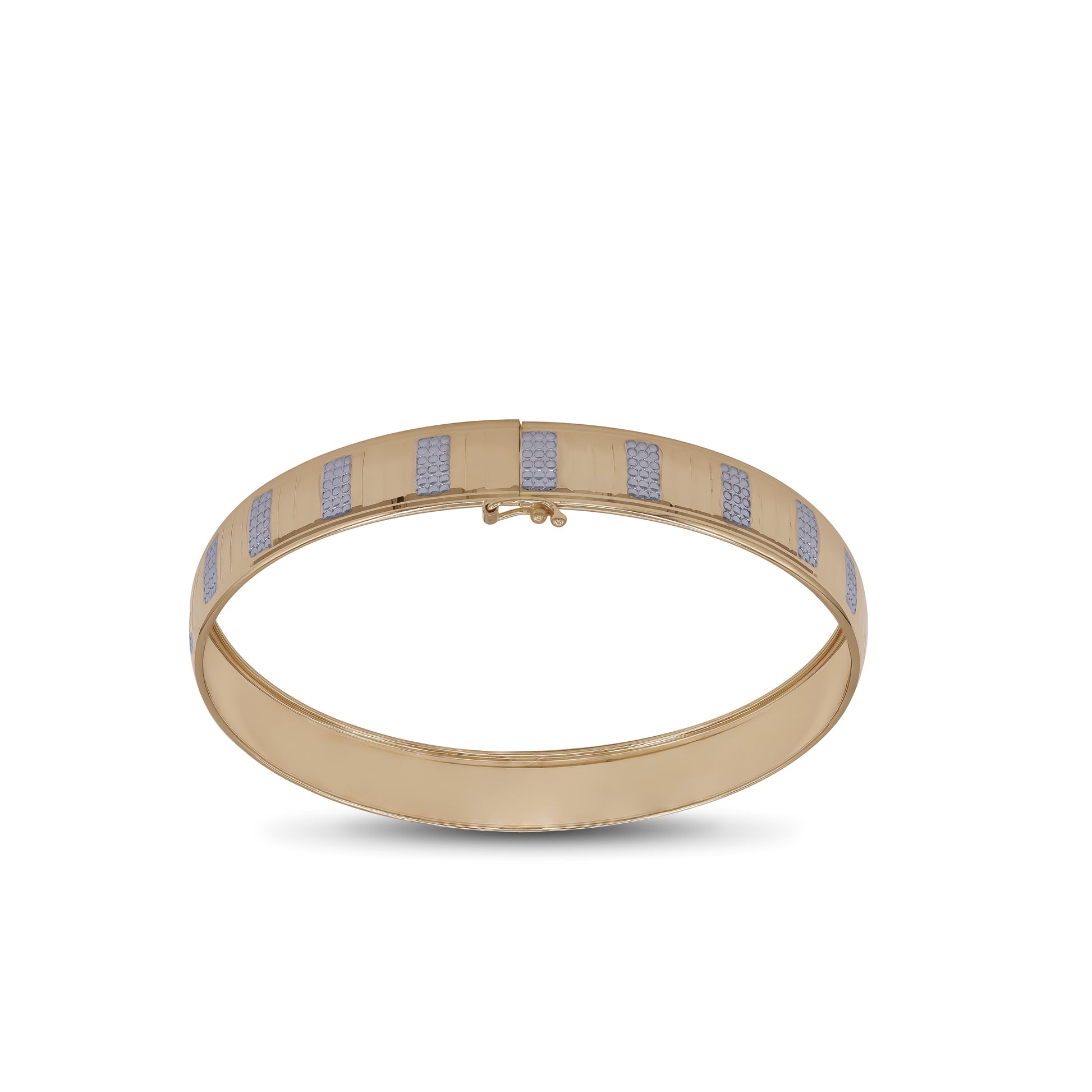 This dual-tone bangle combines the warmth of yellow gold with the cool elegance of white gold. The geometric striped accents add a chic modern twist, making it perfect for women who love contemporary yet timeless jewelry.