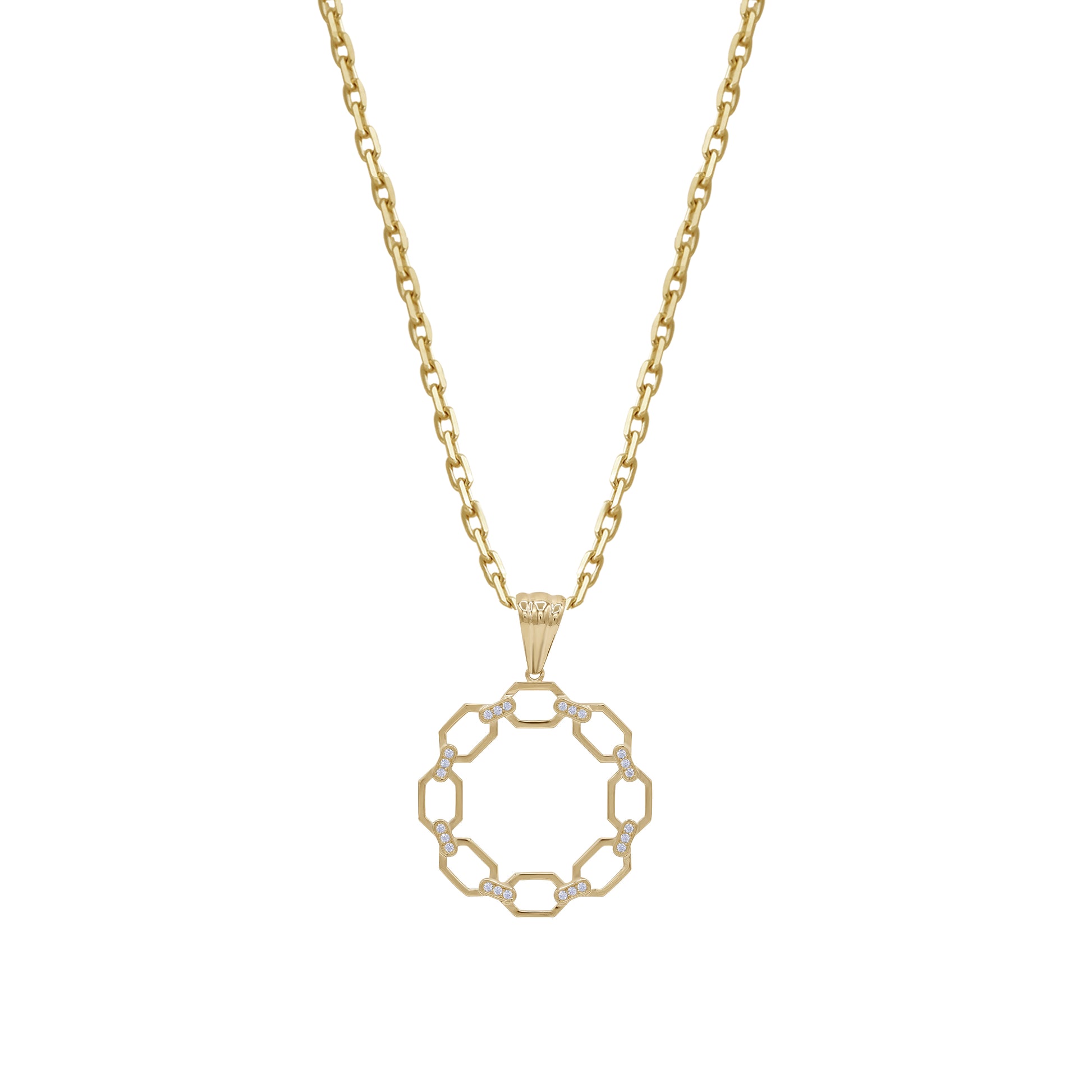Inspired by modern luxury, this circle pendant symbolizes connection, strength, and elegance. Its geometric chain-link details make it a standout piece for everyday wear or special occasions.