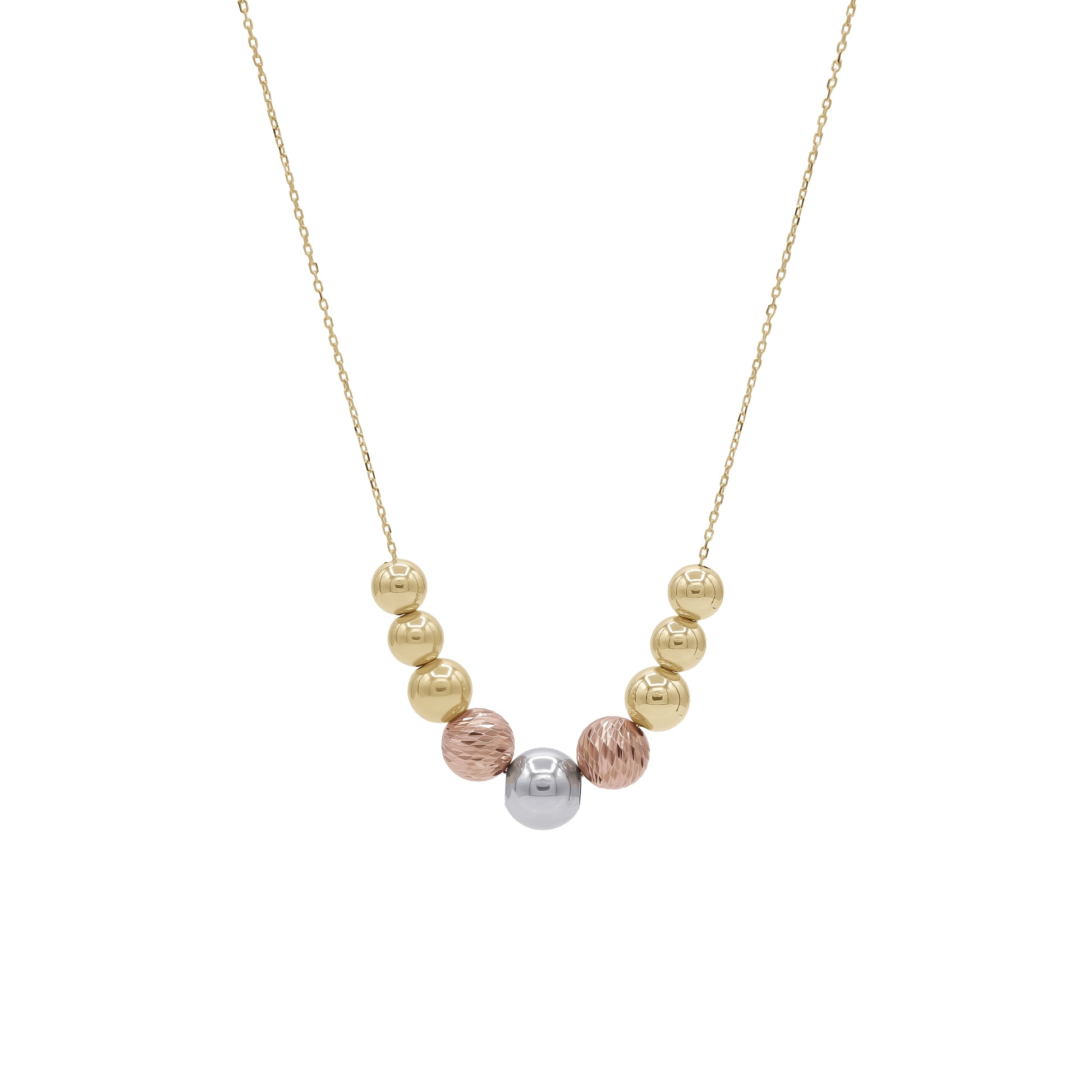 Elevate your everyday style with the 18k Gold Mixed Beads Necklace, crafted with a stunning combination of yellow, rose, and white gold beads arranged in an elegant V-shape. This fine jewelry piece offers a modern, sophisticated look while maintaining timeless minimal elegance.